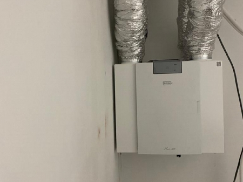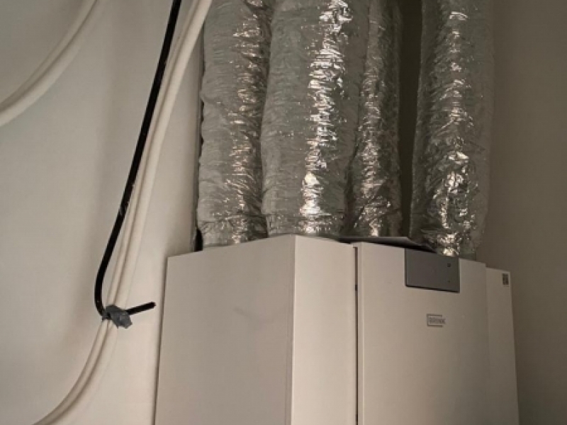 Omdat er ook sanitaire ruimten aanwezig zijn is er de standaard losse vochtsensor gemonteerd in de ventielaansluiting op het luchtkanaal. Grote voordeel is dat het toestel direct een stijging meet en gaat optoeren. Voor de zolder woning is de buitenlucht uitblaas middels een plat dak doorvoer uitgevoerd. De buitenlucht aanzuig is middels een doorvoer waarbij het luchtkanaal over het plat dak is versleept om lucht kortsluiting te voorkomen.