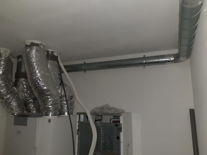 Op de verdieping zijn de 2 toestellen aangesloten (en voorzien van brandkleppen) middels een thermisch geïsoleerd luchtkanaal door de zijgevel. De geïsoleerde muurdoorvoeren zijn speciaal in de RAL kleur gecoat zoals de gevelafwerking. Voor de begane grond zijn de 2 toestellen aangesloten (en voorzien van brandkleppen) middels een thermisch geïsoleerd luchtkanaal door de zijgevel en voorzien van geïsoleerde muurdoorvoeren. Voor de roosters in kelder zijn kanaalroosters toegepast. Voor de roosters ventielen in de woningen zijn voor de inblaas ventielen met schone sector toegepast en voor afzuiging de standaard uitvoering.